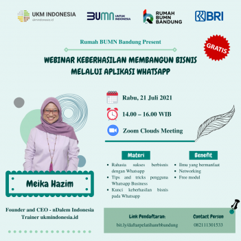Hai Sobat Rumah BUMN Bandung, di masa pandemi seperti ini kita lebih sering berkomunikasi dengan pelanggan secara online, betul? Kalau sobat mau punya skill serta tips and trick menggunakan Whatsapp Business sehingga bisa menarik pelanggan dan berdampak positif pada penjualan produk, jangan lewatkan webinar ini yaa!