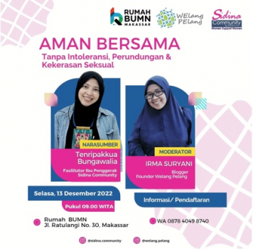 Rumah BUMN Makassar Berkolaborasi dengan Komunitas Welang Pelang dan sidina Community chapter makassar akan melangsungkan kegiatan Pelatihan dengan tema "aman bersama tanpa intoleransi perundungan dan kekerasan sosial" Diharapkan output pelatihan ini akan meningkatkan skill/keterampilan agar dapat membantu meningkatkan kesejahteraan rumah tangga.