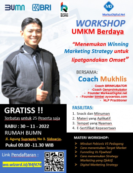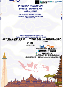 Rumah BUMN Makassar Berkolaborasi dengan Uin Alauddin Makassar akan melangsungkan kegiatan Pelatihan dengan tema "PENINGKATAN SOFTSKILL KEWIRAUSAHAAN MAHASISWA". Diharapkan output pelatihan ini akan meningkatkan skill/keterampilan agar dapat membantu meningkatkan kesejahteraan rumah tangga.