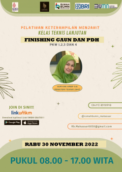 Rumah BUMN Makassar Berkolaborasi dengan Komunitas Dress Maker dan mikromentor chapter makassar akan melangsungkan kegiatan Pelatihan dengan tema "finishing gaun dan pdh kelas teknis pkw 01 02 03 dan 04" Diharapkan output pelatihan ini akan meningkatkan skill/keterampilan agar dapat membantu meningkatkan kesejahteraan rumah tangga.
