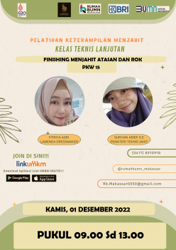 Rumah BUMN Makassar Berkolaborasi dengan Komunitas Dress Maker dan mikromentor chapter makassar akan melangsungkan kegiatan Pelatihan dengan tema "teknik menjahit ban pinggang rok dengan mudh kelas teknik pkw 15" Diharapkan output pelatihan ini akan meningkatkan skill/keterampilan agar dapat membantu meningkatkan kesejahteraan rumah tangga.
