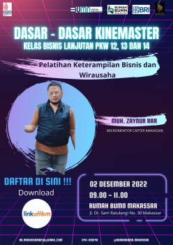 Rumah BUMN Makassar Berkolaborasi dengan Komunitas Dress Maker dan mikromentor chapter makassar akan melangsungkan kegiatan Pelatihan dengan tema "DASAR DASAR KINEMASTER kelas bisnis lanjutan PKW 12 13 14" Diharapkan output pelatihan ini akan meningkatkan skill/keterampilan agar dapat membantu meningkatkan kesejahteraan rumah tangga.