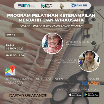 Rumah BUMN Makassar Berkolaborasi dengan Komunitas Dress Maker dan mikromentor chapter makassar akan melangsungkan kegiatan Pelatihan dengan tema "membuat pola dasar badan wanita kelas teknis pkw 15" Diharapkan output pelatihan ini akan meningkatkan skill/keterampilan agar dapat membantu meningkatkan kesejahteraan rumah tangga.
