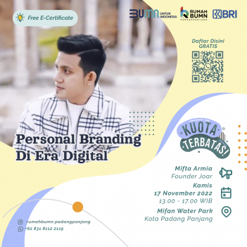 Rumah BUMN Padang Panjang mengadakan Pelatihan "PERSONAL BRANDING DI ERA DIGITAL". Menghadirkan pakar dibidangnya demi kemajuan UMKM Indonesia.