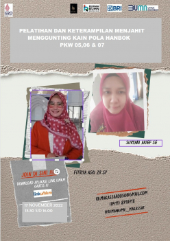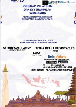 Rumah BUMN Makassar Berkolaborasi dengan Komunitas Dress Maker dan mikromentor chapter makassar akan melangsungkan kegiatan Pelatihan dengan tema "menggunting kain pola pdh kelas teknis lanjutan pkw 1 sampai 9" Diharapkan output pelatihan ini akan meningkatkan skill/keterampilan agar dapat membantu meningkatkan kesejahteraan rumah tangga.
