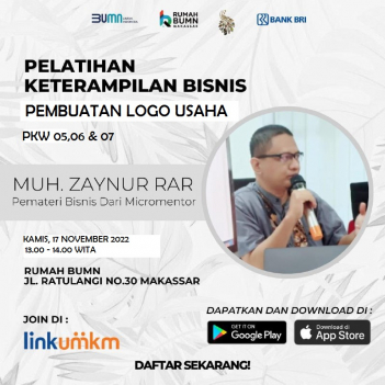 Rumah BUMN Makassar Berkolaborasi dengan Komunitas Dress Maker dan mikromentor chapter makassar akan melangsungkan kegiatan Pelatihan dengan tema "pembuatan logo usaha kelas bisnis lanjutan pkw 5 6 dan 7" Diharapkan output pelatihan ini akan meningkatkan skill/keterampilan agar dapat membantu meningkatkan kesejahteraan rumah tangga.