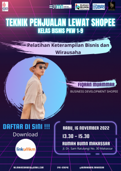 Rumah BUMN Makassar Berkolaborasi dengan Komunitas Dress Maker dan mikromentor chapter makassar akan melangsungkan kegiatan Pelatihan dengan tema "teknik menjual lewat shopee kelas bisnis pkw 1 sampai 9" Diharapkan output pelatihan ini akan meningkatkan skill/keterampilan agar dapat membantu meningkatkan kesejahteraan rumah tangga.