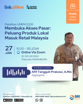 Deskripsi KegiatanMembuka Akses Pasar: Peluang Produk Lokal Masuk Retail MalaysiaTanggal : 27 Januari 2026Pukul : 10.00 s.d selesaiTempat : Zoom MeetingLihat Detail