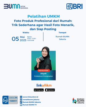Judul,Pelatihan UMKM Literasi Dasar, Foto Produk Profesional dari Rumah Trik Sederhana agar Hasil Foto Menarik, dan Siap PostingTanggal,Senin, 5 Mei 2025Waktu,13.00-15.00 WIBNarasumber,Aisyah Aulia - Professional PhotographerTempat, Rumah BUMN JakartaLihat Detail