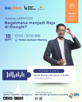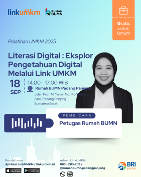 Rumah BUMN Padang Panjang mengadakan Pelatihan Literasi Digital Eksplor Pengetahuan Digital Melalui Link UMKM. Menghadirkan pakar dibidangnya demi kemajuan UMKM Indonesia.