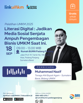 Rumah BUMN Padang Panjang mengadakan Pelatihan Literasi Digital Jadikan Media Sosial Senjata Ampuh Pengembagan Bisnis UMKM Saat Ini. Menghadirkan pakar dibidangnya demi kemajuan UMKM Indonesia.