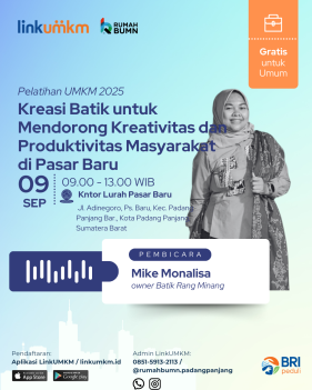 Rumah BUMN Padang Panjang mengadakan Pelatihan Kreasi Batik untuk Mendorong Kreativitas dan Produktivitas Masyarakat di Pasar Baru. Menghadirkan pakar dibidangnya demi kemajuan UMKM Indonesia.