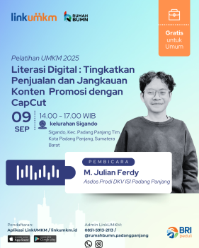 Rumah BUMN Padang Panjang mengadakan Pelatihan Literasi Digital Tingkatkan Penjualan dan Jangkauan Konten Promosi dengan CapCut. Menghadirkan pakar dibidangnya demi kemajuan UMKM Indonesia.