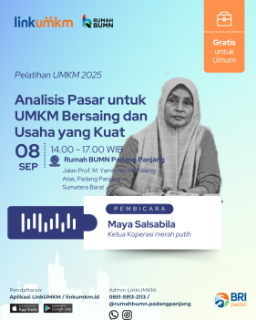 Rumah BUMN Padang Panjang mengadakan Pelatihan Analisis Pasar untuk UMKM Bersaing dan Usaha yang Kuat. Menghadirkan pakar dibidangnya demi kemajuan UMKM Indonesia.