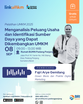 Rumah BUMN Padang Panjang mengadakan Pelatihan Menganalisis Peluang Usaha dan Identifikasi Sumber Daya yang Dapat Dikembangkan UMKM. Menghadirkan pakar dibidangnya demi kemajuan UMKM Indonesia.