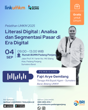 Rumah BUMN Padang Panjang mengadakan Pelatihan Literasi Digital Analisa dan Segmentasi Pasar di Era Digital. Menghadirkan pakar dibidangnya demi kemajuan UMKM Indonesia.