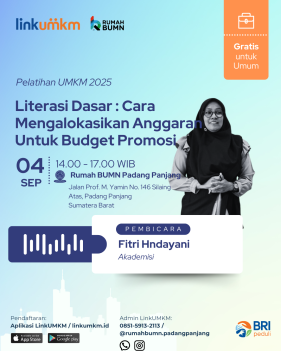 Rumah BUMN Padang Panjang mengadakan Pelatihan Literasi Dasar Cara Mengalokasikan Anggaran Untuk Budget Promosi. Menghadirkan pakar dibidangnya demi kemajuan UMKM Indonesia.