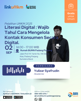 Rumah BUMN Padang Panjang mengadakan PelatihanLiterasi Digital Wajib Tahu Cara Mengelola Kontak Konsumen Secara Digital. Menghadirkan pakar dibidangnya demi kemajuan UMKM Indonesia.