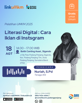 Rumah BUMN Padang Panjang mengadakan Pelatihan Literasi Digital : Cara Iklan di Instsgram. Menghadirkan pakar dibidangnya demi kemajuan UMKM Indonesia.