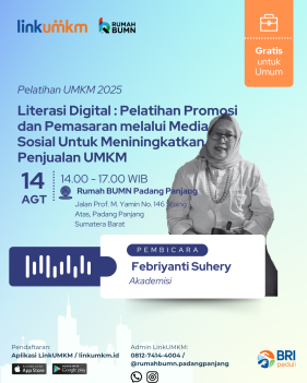 Rumah BUMN Padang Panjang mengadakan Pelatihan Literasi Digital Pelatihan Promosi dan Pemasaran melalui Media Sosial Untuk Meniningkatkan Penjualan UMKM . Menghadirkan pakar dibidangnya demi kemajuan UMKM Indonesia.