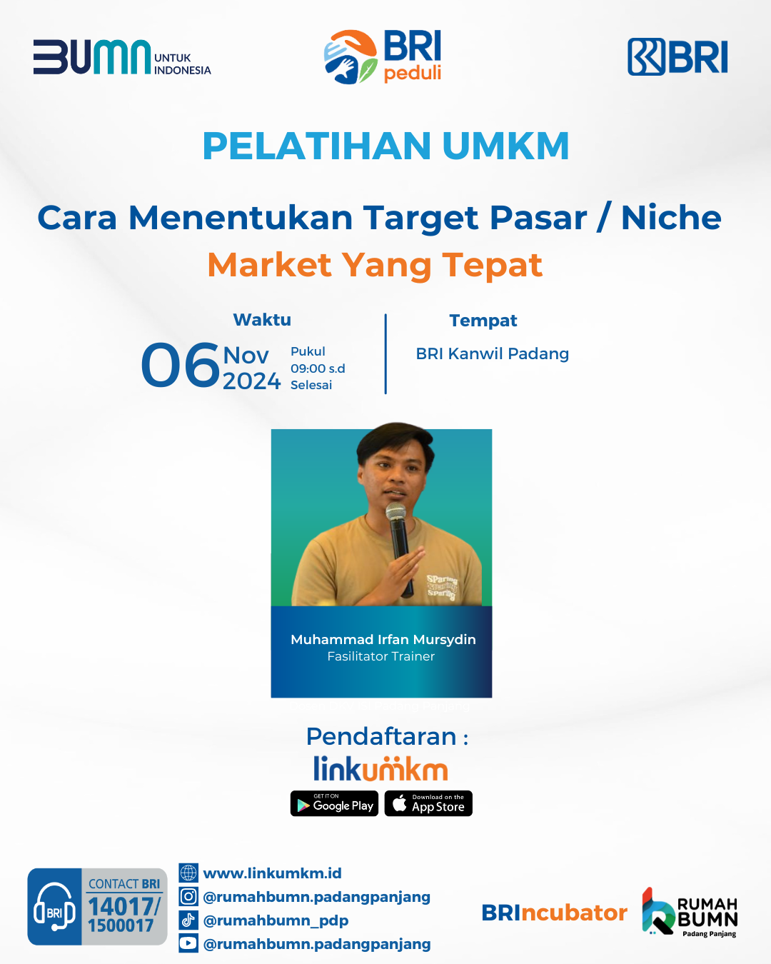 Rumah BUMN Padang Panjang mengadakan Pelatihan Cara Menentukan Target Pasar Niche Market Yang Tepat. Menghadirkan pakar dibidangnya demi kemajuan UMKM Indonesia.