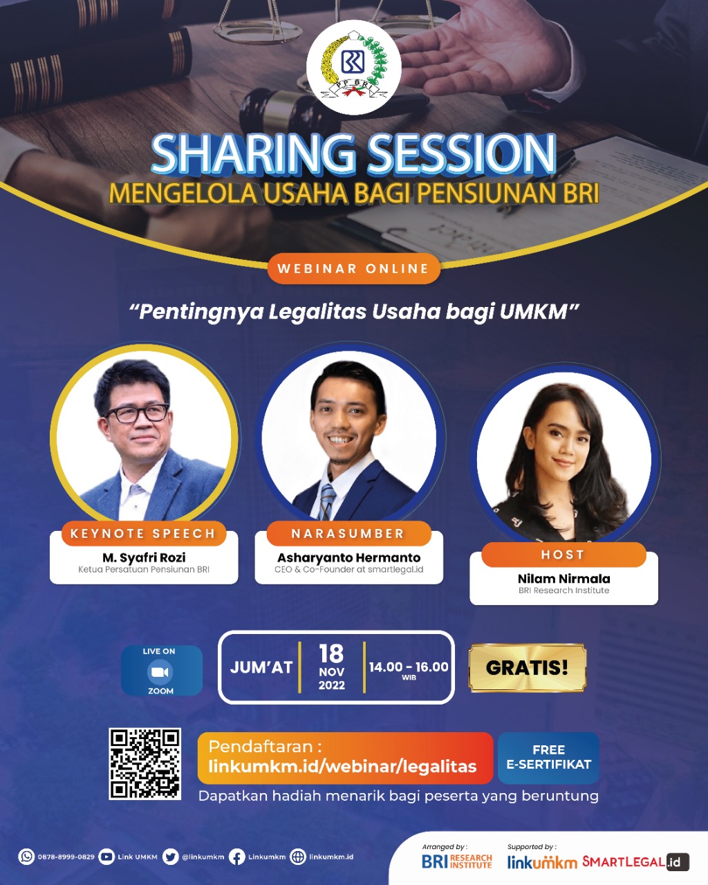 Persatuan Pensiunan BRI bersama BRI Research Institute menghadirkan Webinar Online: "Pentingnya Kepemilikan Legalitas Usaha bagi UMKM"