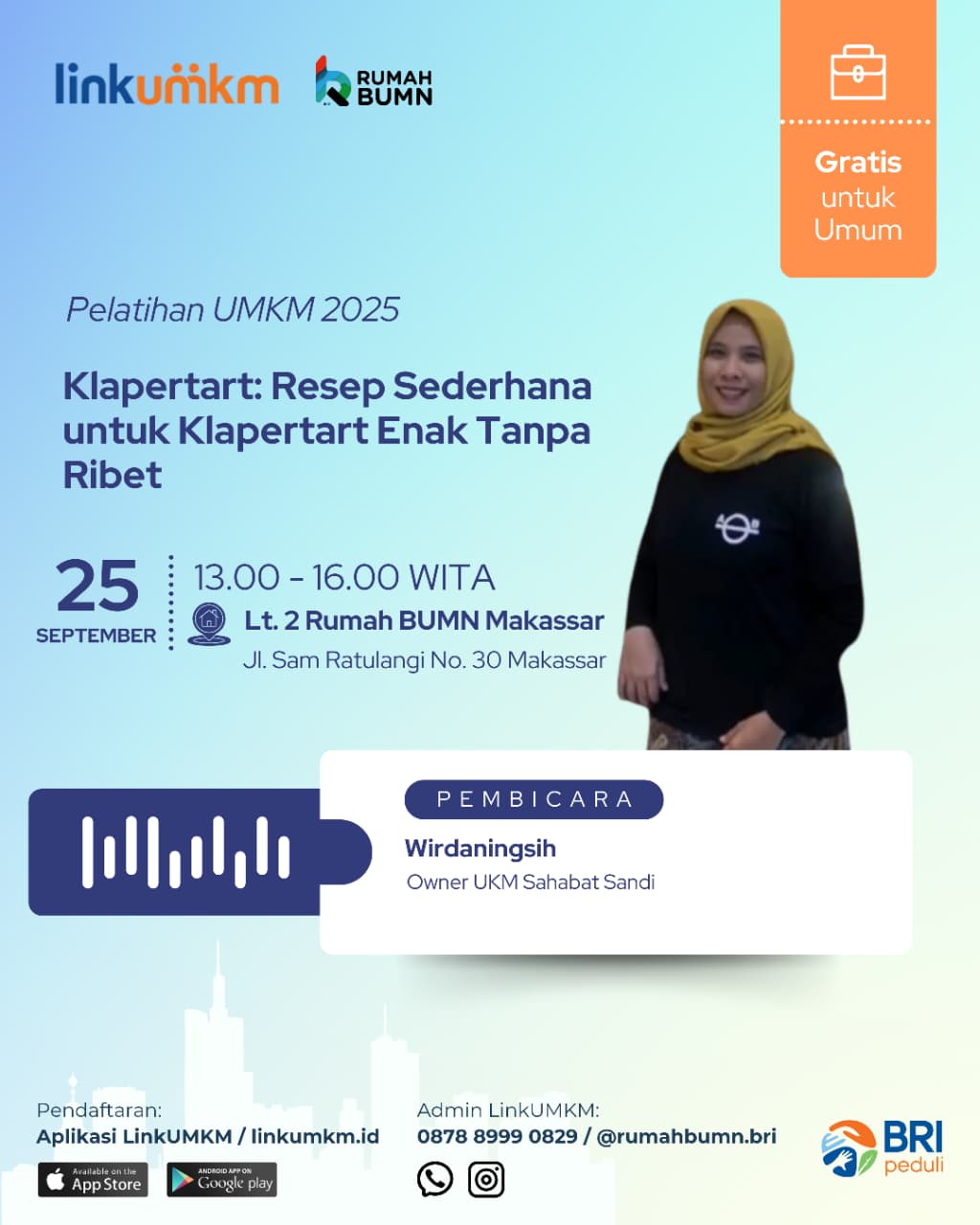 Tempat:Jl.Sam Ratulangi No.30 (Lt. 2 Rumah BUMN Makassar)