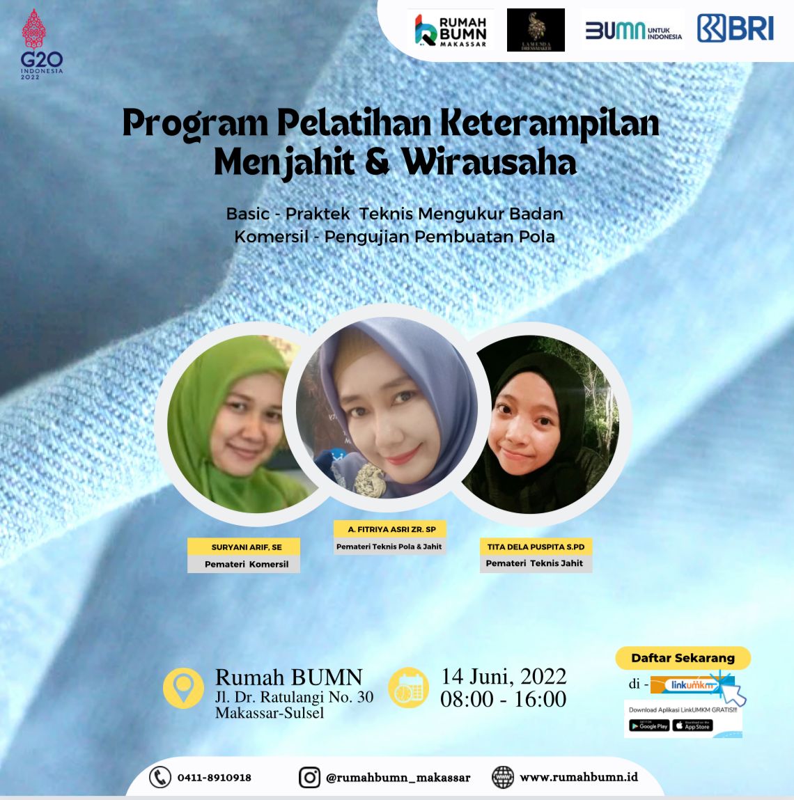 Rumah BUMN Makassar Berkolaborasi dengan Komunitas Jarum Benang akan melangsungkan kegiatan Pelatihan Fhasion “Basic - Praktek Teknis Mengukur Badan”. Diharapkan output pelatihan ini akan meningkatkan skill/keterampilan agar dapat membantu meningkatkan kesejahteraan rumah tangga.