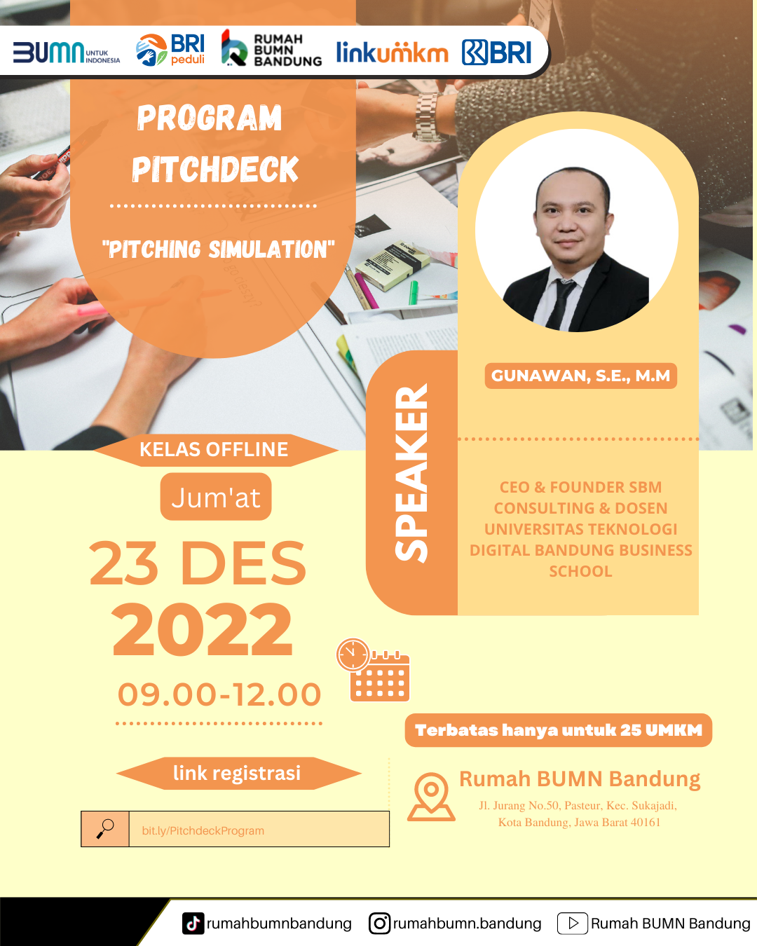 Rumah BUMN sedang ngadain pelatihan mengenai "Pitching Simulation" bersama Pak Gunawan yang akan diikutsertakan oleh 25 peserta terpilih