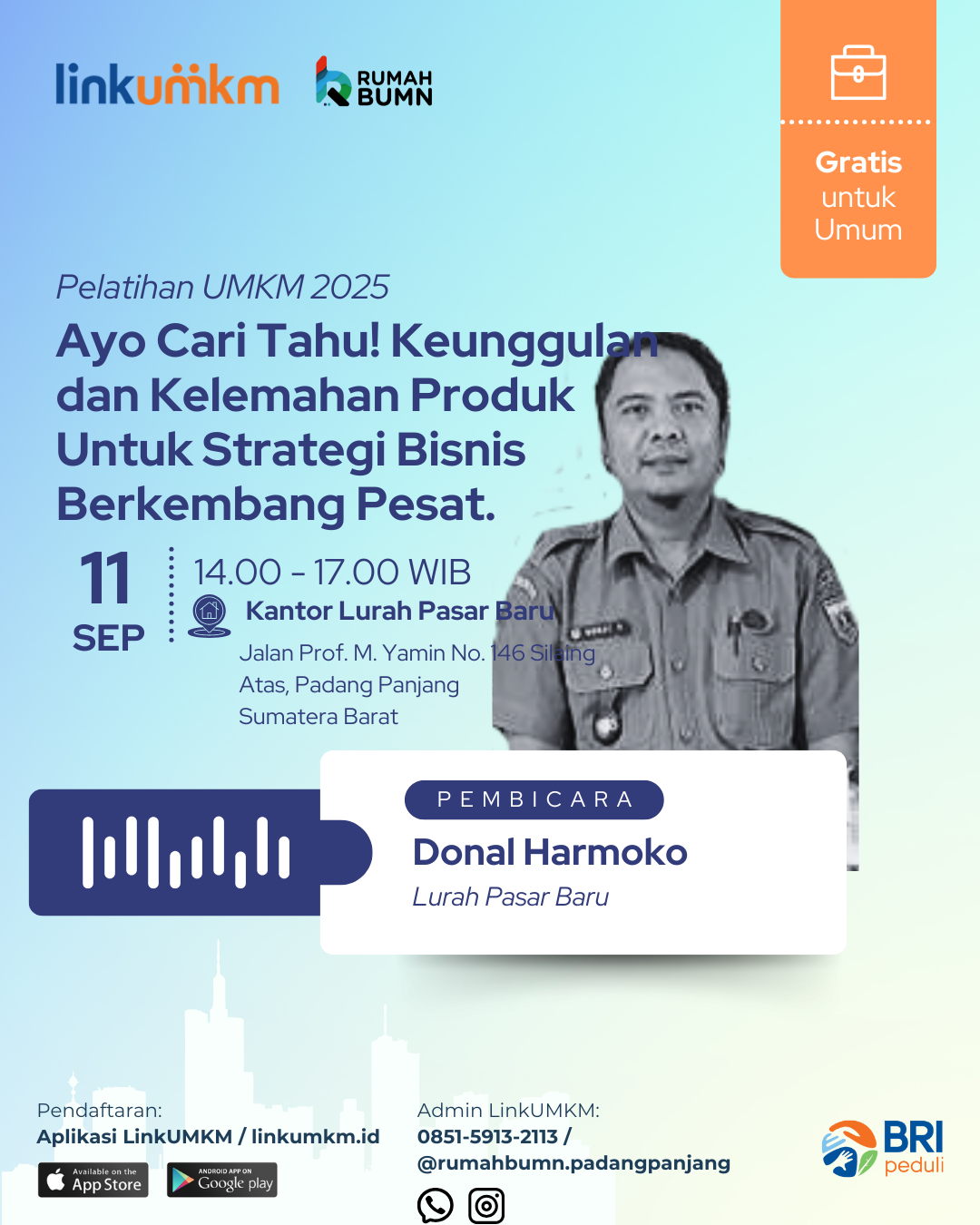 Rumah BUMN Padang Panjang mengadakan Pelatihan Ayo Cari Tahu Keunggulan dan Kelemahan Produk Untuk Strategi Bisnis Berkembang Pesat. Menghadirkan pakar dibidangnya demi kemajuan UMKM Indonesia.