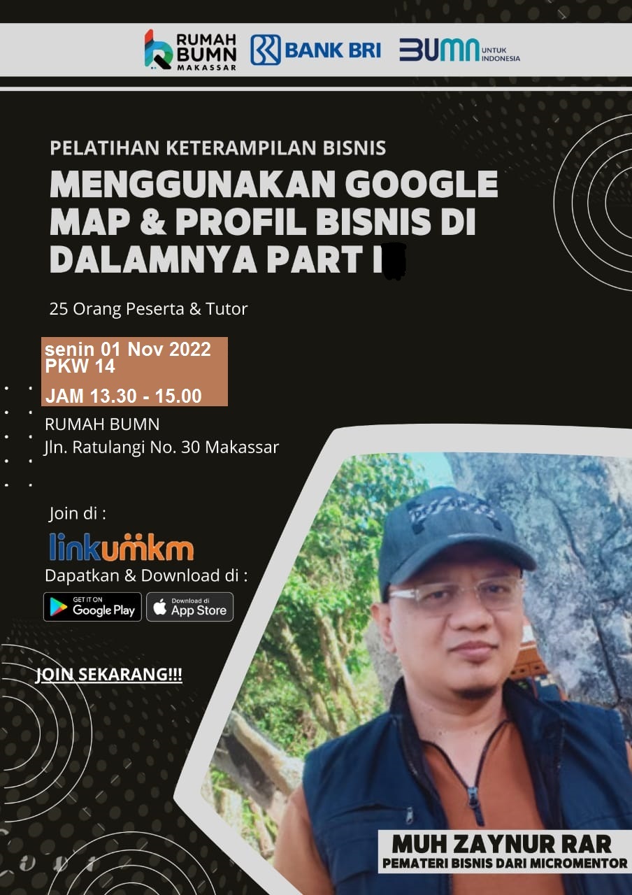 Rumah BUMN Makassar Berkolaborasi dengan Komunitas Dress Maker dan mikromentor chapter makassar akan melangsungkan kegiatan Pelatihan dengan tema "GOOGLE MAP DAN FITUR-FITUR BISNIS DI DALAMNYA PART 1 (KELAS BISNIS PKW 14)" Diharapkan output pelatihan ini akan meningkatkan skill/keterampilan agar dapat membantu meningkatkan kesejahteraan rumah tangga.
