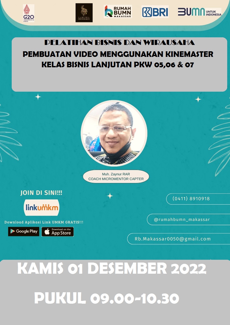Rumah BUMN Makassar Berkolaborasi dengan Komunitas Dress Maker dan mikromentor chapter makassar akan melangsungkan kegiatan Pelatihan dengan tema "PEMBUATAN VIDEO MENGGUNAKAN KINEMASTER KELAS BISNIS LANJUTAN PKW 05 06 07" Diharapkan output pelatihan ini akan meningkatkan skill/keterampilan agar dapat membantu meningkatkan kesejahteraan rumah tangga.