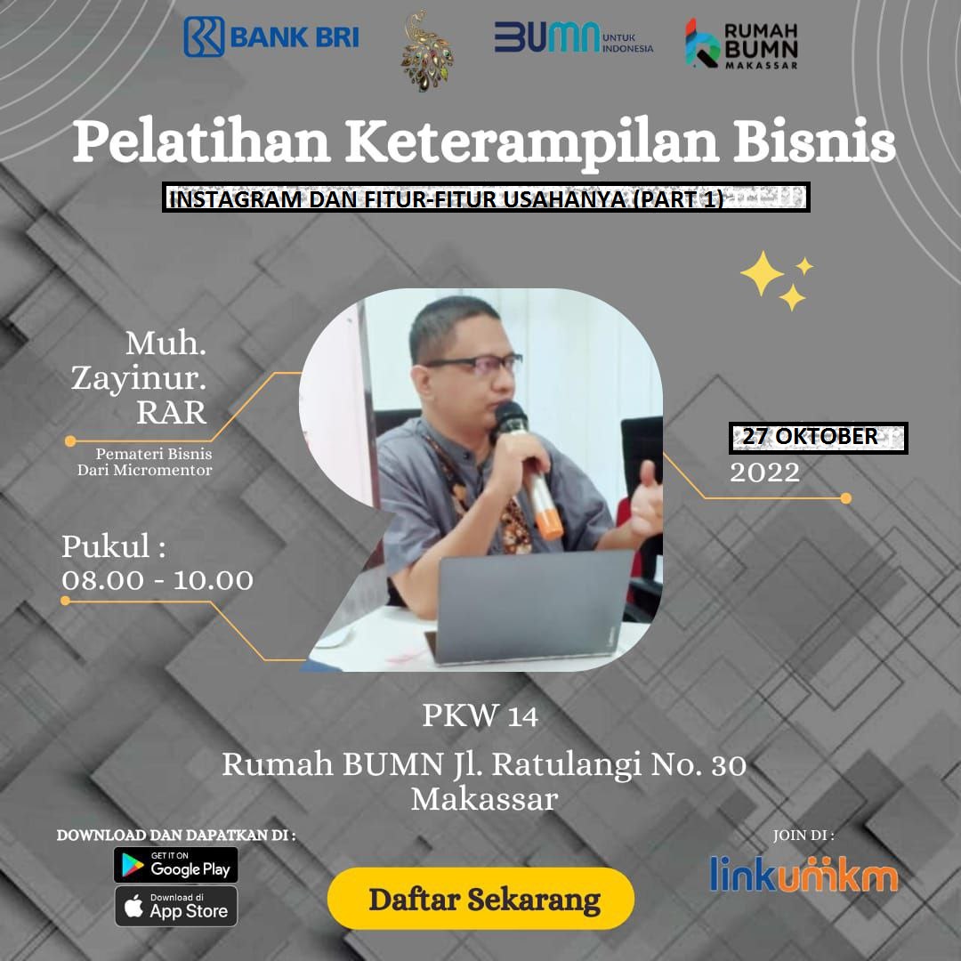 Rumah BUMN Makassar Berkolaborasi dengan Komunitas Dress Maker dan mikromentor chapter makassar akan melangsungkan kegiatan Pelatihan dengan tema "INSTAGRAM DAN FITUR - FITUR USAHANYA PART 1 (KELAS TEKNIS PKW 14)". Diharapkan output pelatihan ini akan meningkatkan skill/keterampilan agar dapat membantu meningkatkan kesejahteraan rumah tangga.