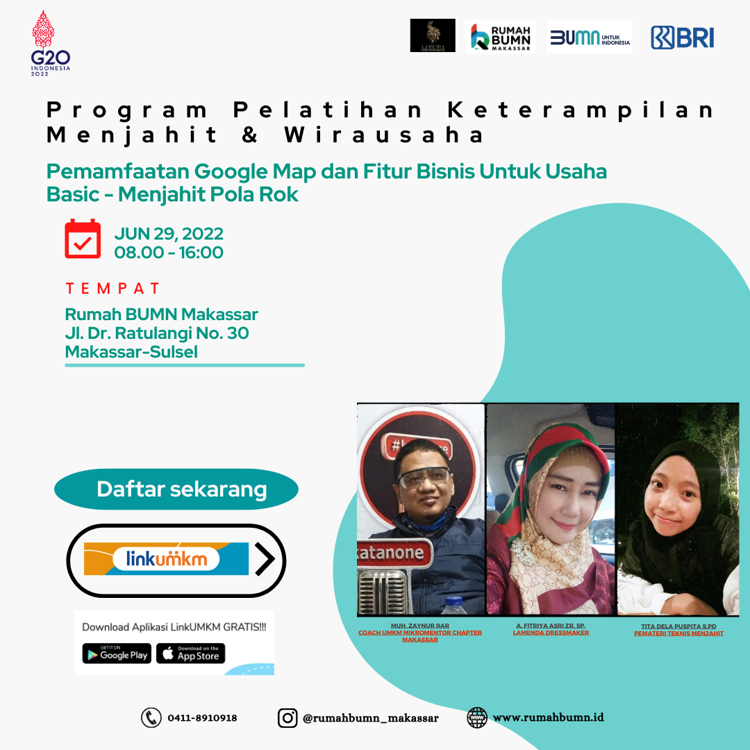 Rumah BUMN Makassar Berkolaborasi dengan Komunitas Dress Maker dan mikromentor chapter makassar akan melangsungkan kegiatan Pelatihan “Pemamfaatan Google Map dan Fitur Bisnis Untuk Usaha”. Diharapkan output pelatihan ini akan meningkatkan skill/keterampilan agar dapat membantu meningkatkan kesejahteraan rumah tangga.