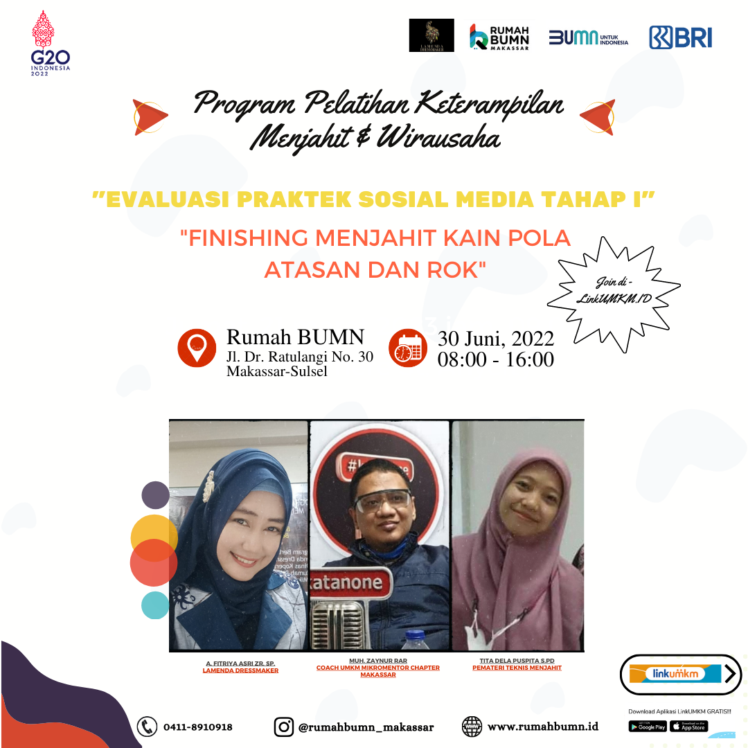 Rumah BUMN Makassar Berkolaborasi dengan Komunitas Dress Maker dan mikromentor chapter makassar akan melangsungkan kegiatan Pelatihan “Evaluasi Praktek Sosial Media I”. Diharapkan output pelatihan ini akan meningkatkan skill/keterampilan agar dapat membantu meningkatkan kesejahteraan rumah tangga.