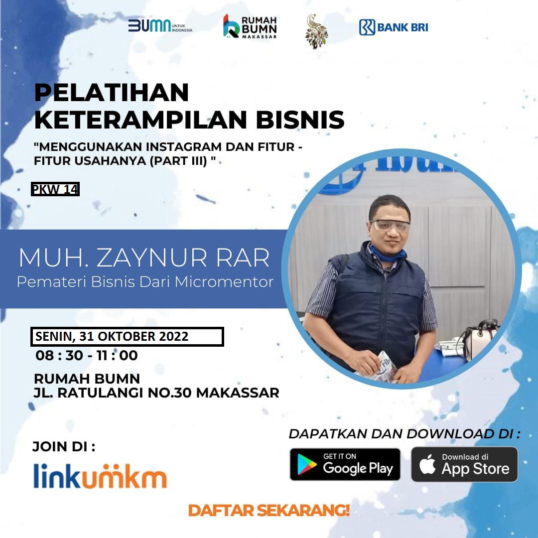Rumah BUMN Makassar Berkolaborasi dengan Komunitas Dress Maker dan mikromentor chapter makassar akan melangsungkan kegiatan Pelatihan dengan tema "INSTAGRAM DAN FITUR-FITUR USAHANYA PART 3( KELAS BISNIS PKW 14)". Diharapkan output pelatihan ini akan meningkatkan skill/keterampilan agar dapat membantu meningkatkan kesejahteraan rumah tangga.