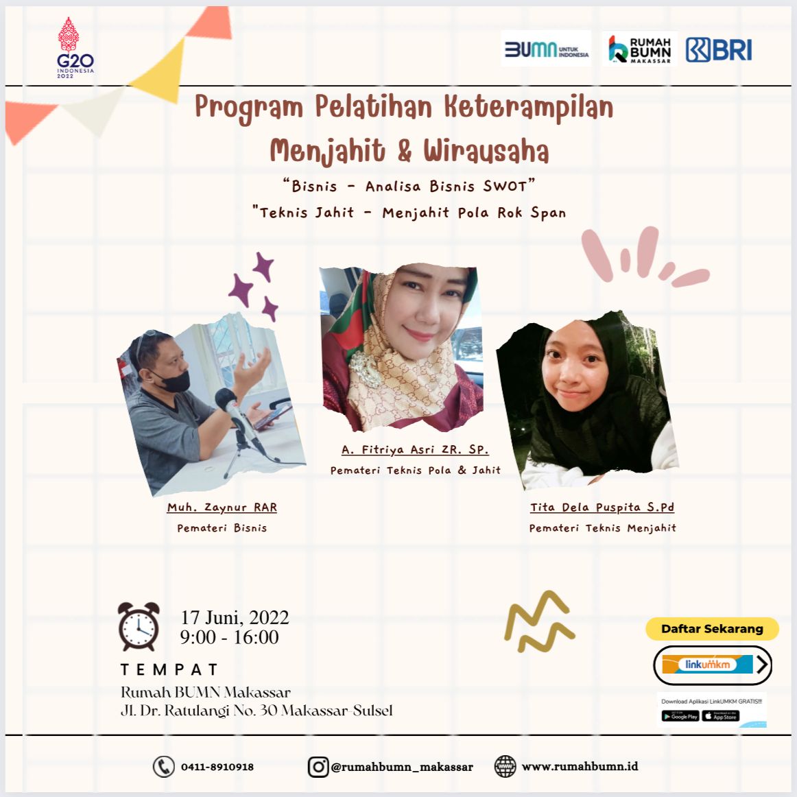 Rumah BUMN Makassar Berkolaborasi dengan Komunitas Jarum Benang akan melangsungkan kegiatan Pelatihan “Analisa Bisnis SWOT”. Diharapkan output pelatihan ini akan meningkatkan skill/keterampilan agar dapat membantu meningkatkan kesejahteraan rumah tangga.