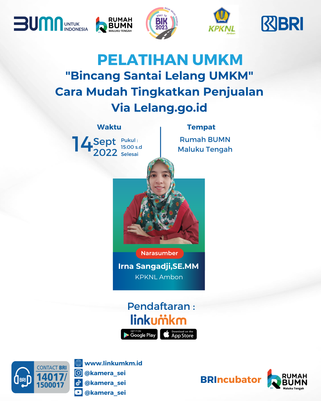 Rumah BUMN Maluku Tengah Berkolaborasi dengan KPKNL Ambon dalam rangka pelatihan UMKM dalam bidang pemasaran dengan topik Bincang Santai Lelang UMKM" Cara Mudah Tingkatkan Penjualan Via Lelang.go.id dengan Narasumber Ibu Irna Sangadji, SE.M.M beliau adalah Fungsional Pelelangan Ahli Pertama KPKNL Ambon.