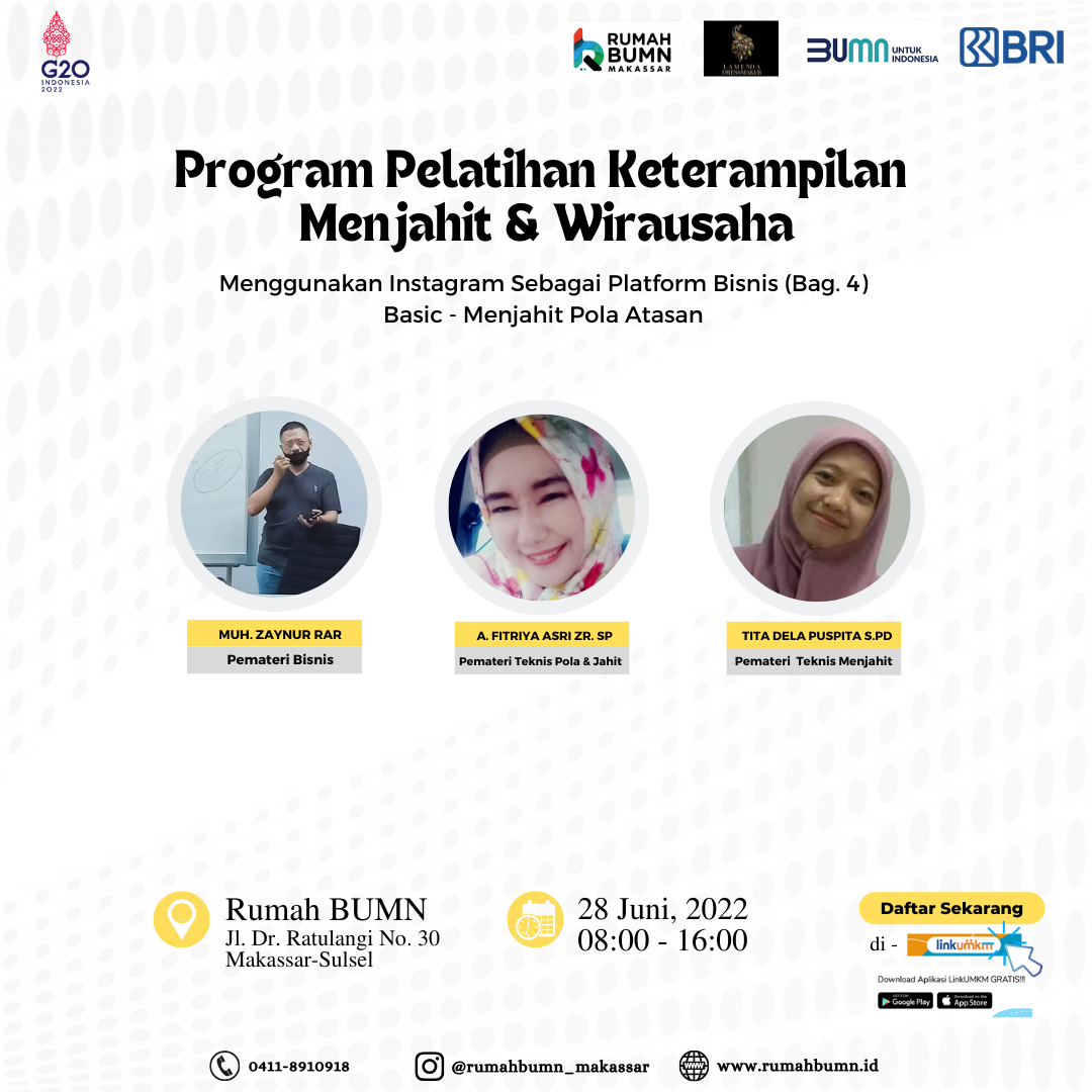 Rumah BUMN Makassar Berkolaborasi dengan Komunitas Jarum Benang akan melangsungkan kegiatan Pelatihan “Bisnis - Menggunakan Instagram Seabagai Platform Bisnis (Bag.4)”. Diharapkan output pelatihan ini akan meningkatkan skill/keterampilan agar dapat membantu meningkatkan kesejahteraan rumah tangga.