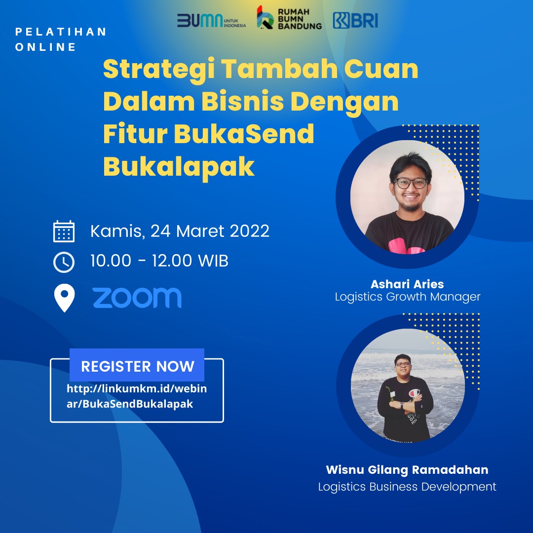 Punya akun Bukalapak untuk menjual produkmu tapi gatau strategi untuk memaksimalkan profit? Jangan khawatir, mimin punya solusinya! Yuk, ikuti pelatihan online yang akan diselenggarakan bersama Bukalapak dengan tema “Strategi Tambah Cuan Dalam Bisnis Dengan Fitur BukaSend Bukalapak”. Materi akan disampaikan oleh Kang Ashari Aries selaku Logistics Growth Manager dan Kang Wisnu Gilang Ramadahan selaku Logistics Business Development.