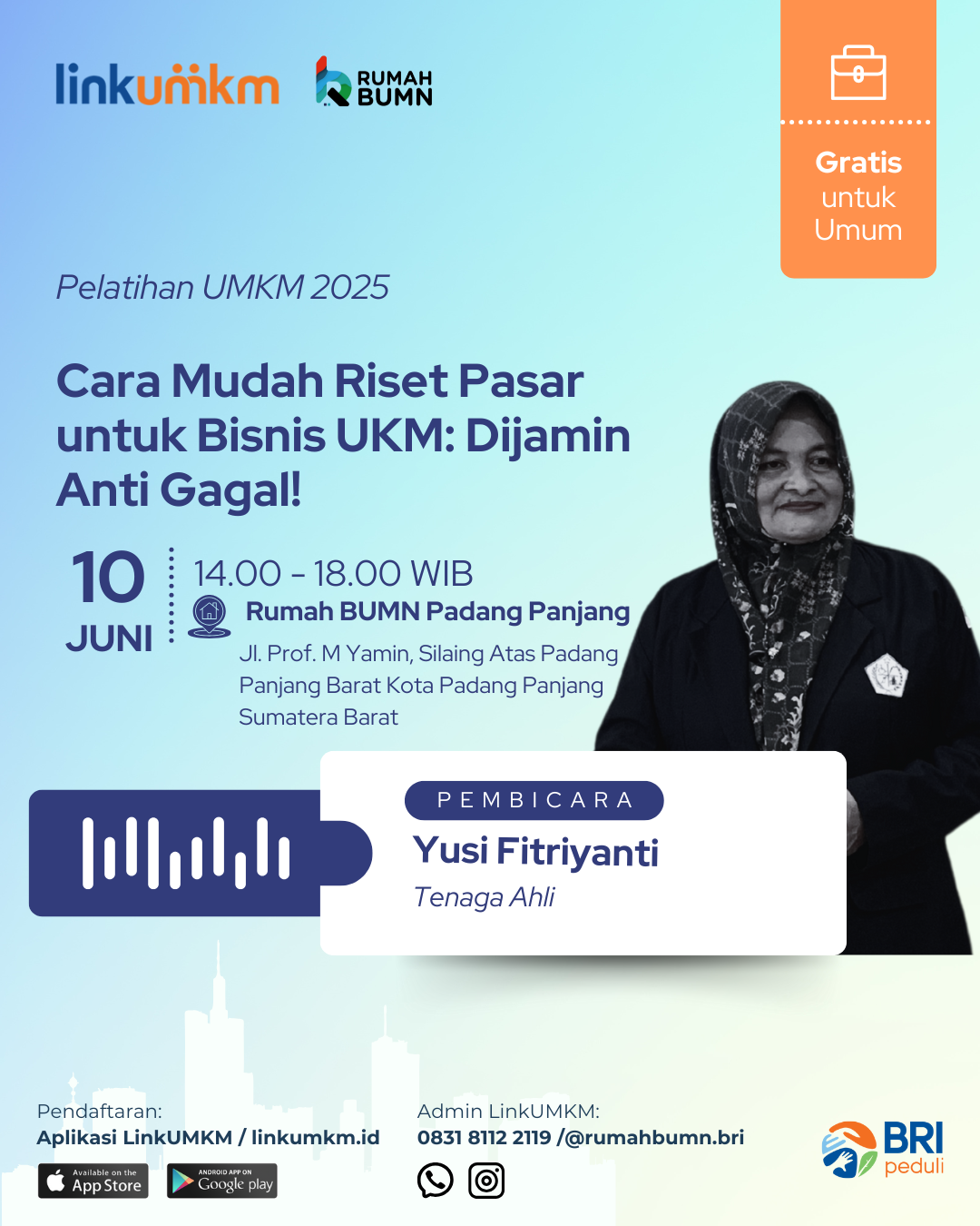 Rumah BUMN Padang Panjang mengadakan Cara Mudah Riset Pasar untuk Bisnis UKM Dijamin Anti Gagal. Menghadirkan pakar dibidangnya demi kemajuan UMKM Indonesia.