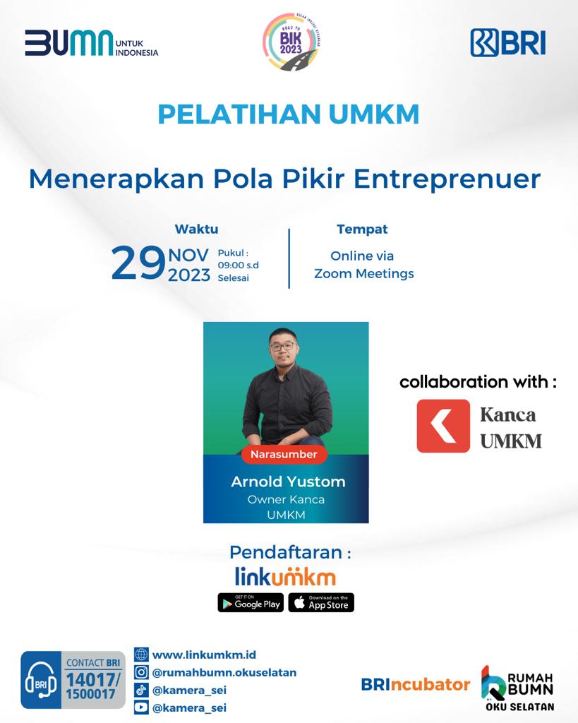 Tentunya pemateri pelatihan kali ini adalah Mas Arnold Yustom Owner Kanca UMKM yang sudah sangat baik didalam Menerapkan Pola Pikir Entreprenuer