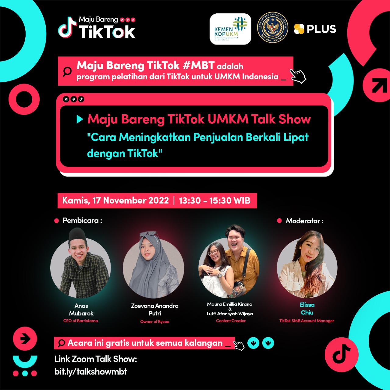 Sebagai bagian dari rangkaian program MBT, kami akan mengadakan kegiatan MBT UMKM Talk Show dengan tema “Cara Meningkatkan Penjualan Berkali Lipat dengan TikTok” yang diharapkan dapat menginspirasi dan mengedukasi para pelaku UMKM untuk mengembangkan usaha mereka di dalam ekosistem TikTok.