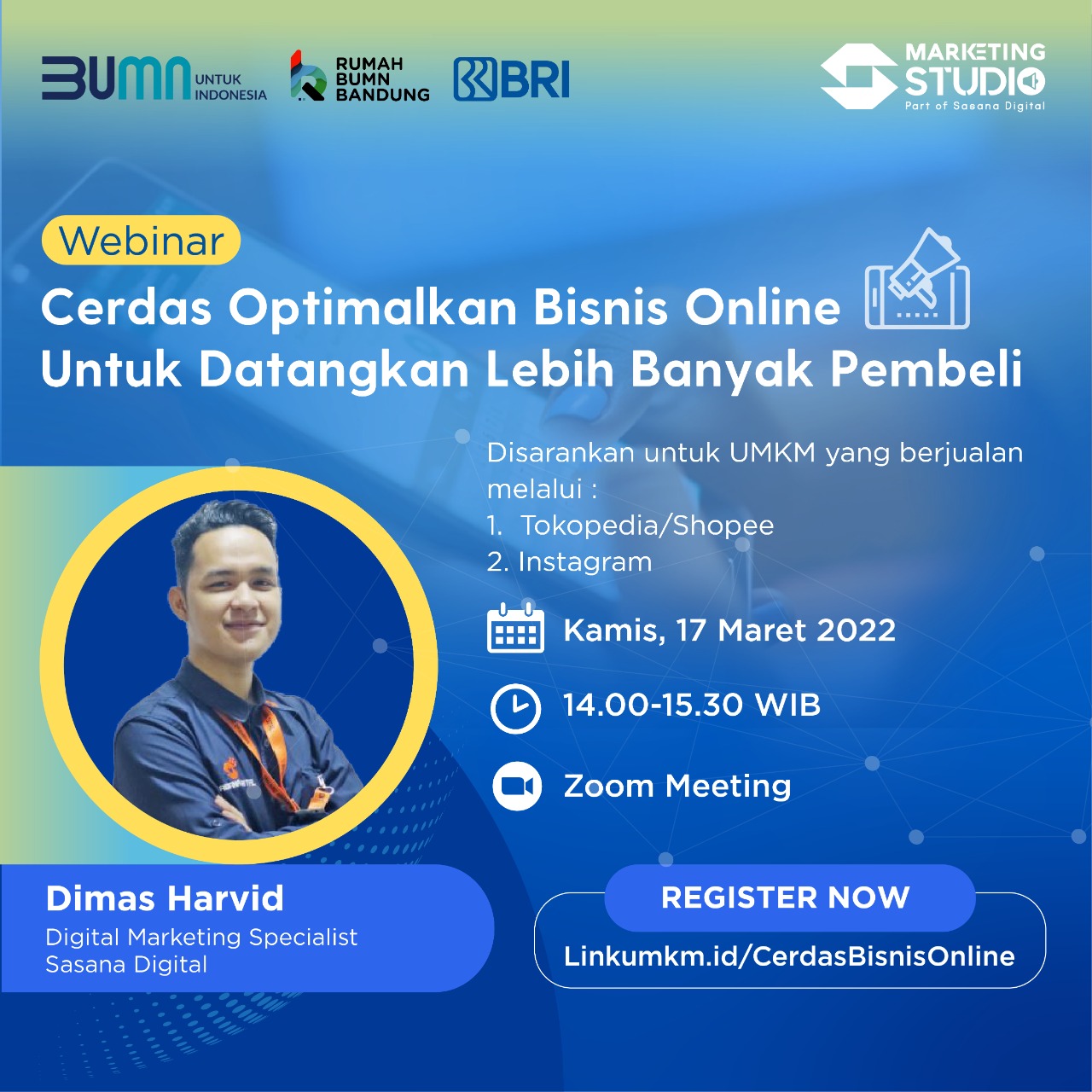 Kamu kesulitan berjualan di E-commerce/Sosial Media? Produk yang kamu jual tidak ada yang melirik? Gausah khawatir! Yuk, ikuti webinar yang diselenggarakan Sasana Digital bersama Rumah BUMN Bandugn dengan tema “Cerdas Optimalkan Bisnis Online Untuk Datangkan Lebih Banyak Pembeli” bersama Pak Dimas Harvid sebagai Digital Marketing Specialist di Sasana Digital. Materi yang akan disampaikan, antara lain: