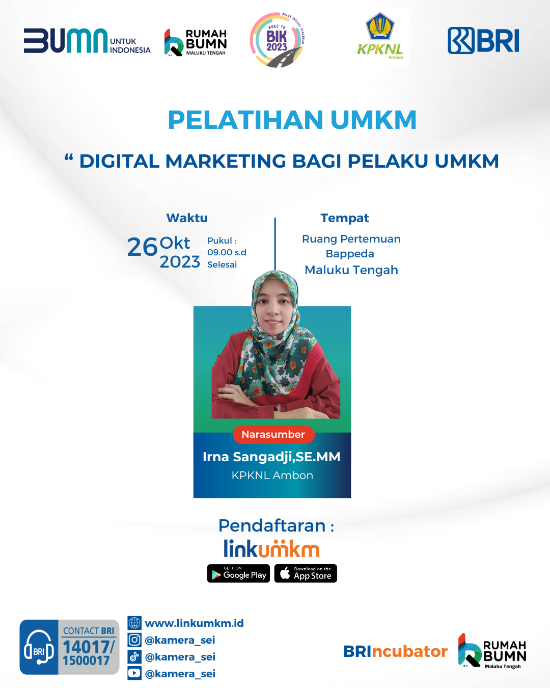 Rumah BUMN Maluku Tengah berkolaborasi dengan KPKNL Ambon melakukan Sosialiasi bersama kepada para UMKM dengan Tema " Digital Marketing Bagi Pelaku UMKM" dengan kuota peserta UMKM sebanyak 20 UMKM.