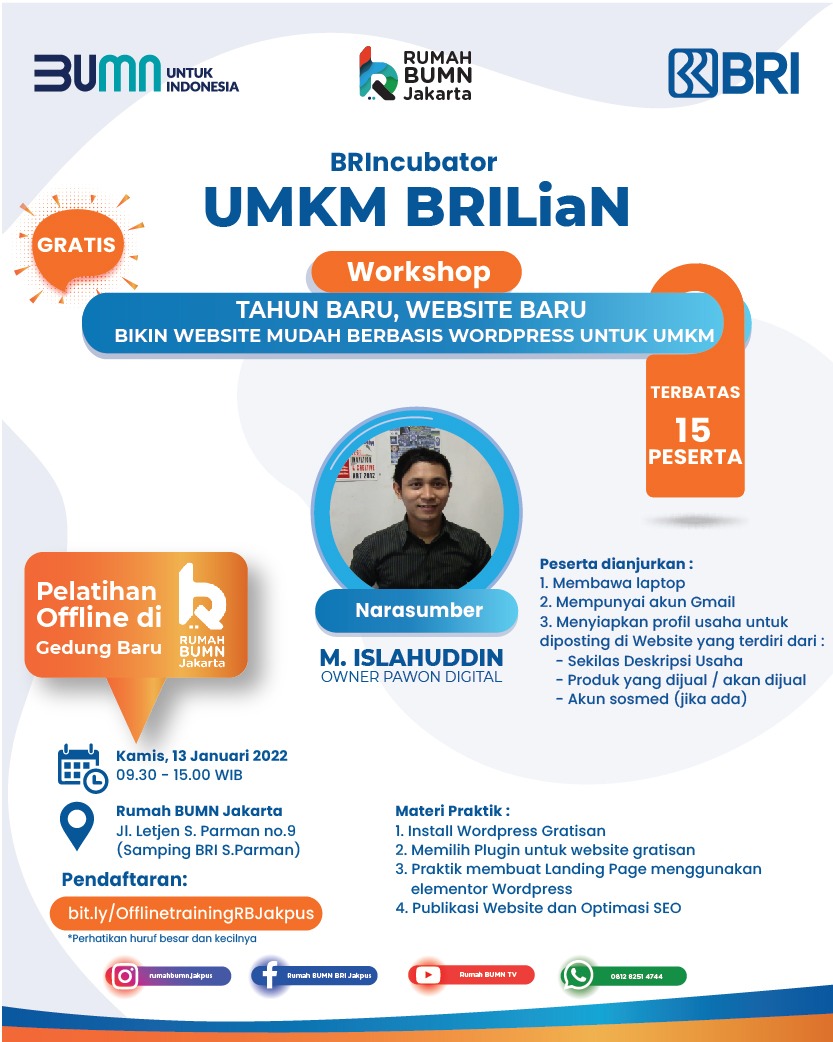 Menjelang tahun baru, tentu harus ada resolusi yang lebih baik dari tahun sebelumnya. Kali ini RUMAH BUMN JAKARTA akan menghadirkan Workshop Membuat Website yang mudah dipelajari bagi UMKM sebagai resolusi tahun baru anda. Penasaran? Yuk cek informasi dibawah ini :