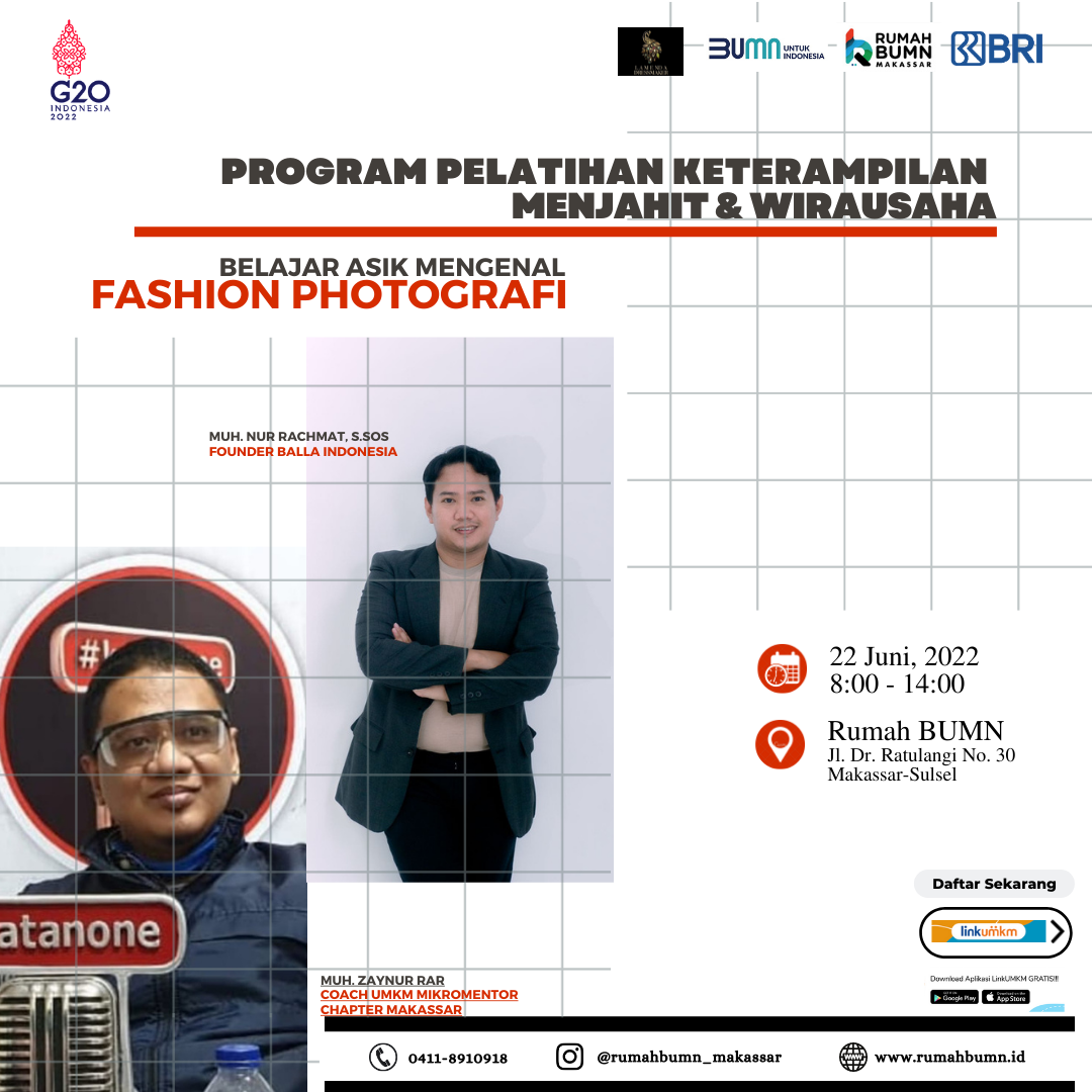 Fotografi fashion adalah genre fotografi yang ditujukan untuk menampilkan pakaian dan barang-barang fashion lainnya. Pada umumnya fotografi fashion akan berfokus pada pakaian atau aksesoris yang dikenakan model, para fotografer juga cenderung menggunakan pencahayaan yang dramatis. pelatitihan tersebut diharapkan dapat membantu umkm dalam menampilkan karya di dunia digital untuk meningkatkan pemasaran umkm sehingga penjualan umkm meningkat pula.
