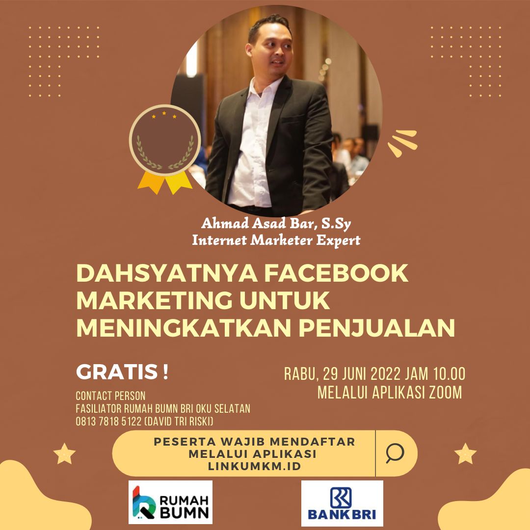 Facebook marketing merupakan salah satu kebtuhan para pelaku bisnis terutama salah satu kebutuhan para pelaku bisnis terutama bisnis online. melalui pelatihan ini bertujuan memperkenalkan kepada umkm indonesia untuk memasarkan produk dan membangun komunikasi intens dengan pelanggan agar meningkatkan pendapatan penjualan.