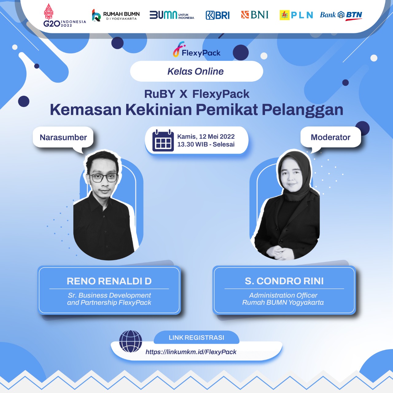 Bingung gimana cara nya membuat kemasan kekinian yg menarik pelanggan supaya banyak yg suka. Pas banget, RuBY X Flexypack bakal mengadakan kelas tentang "Kemasan Kekinian Pemikat Pelanggan"