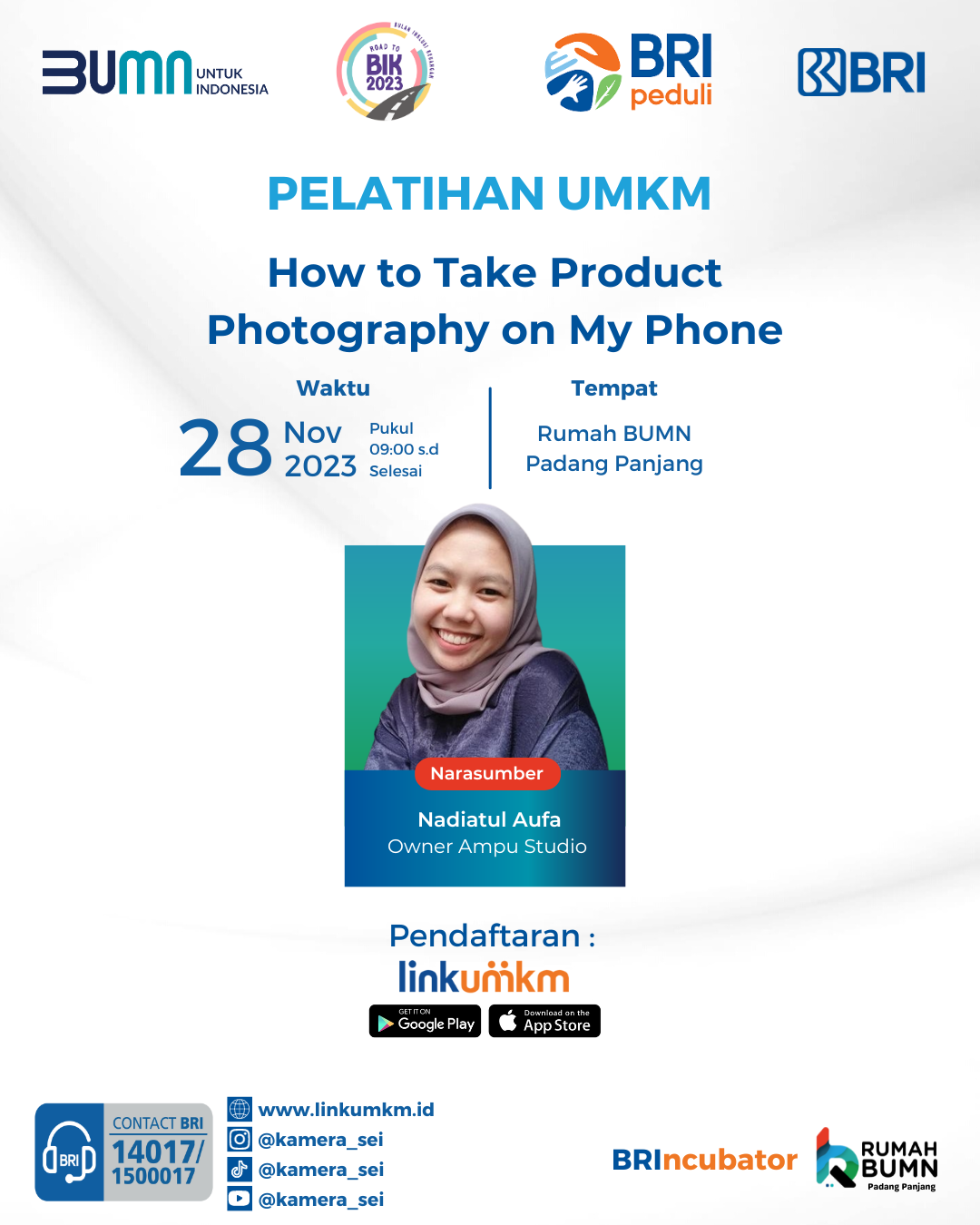 Rumah BUMN Padang Panjang mengadakan Pelatihan How to Take Product Photography on My Phone. Menghadirkan pakar dibidangnya demi kemajuan UMKM Indonesia.